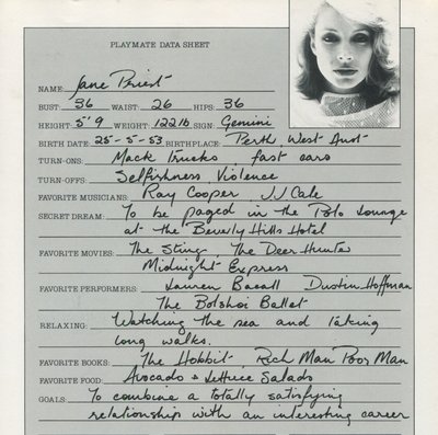 Jane Priest Nude 22 pics Country of birth: Australia Place of birth: Perth Date of birth: May 25, 1953 Ethnicity: White Hair color: Brunette Breast size: Medium (Real) Profession: Model Celebs from Australia Erin Walsh Simone Taylor Marni Russo Glenys O'brien Elizabeth Kell Ashley Jenning Jane Priest Tags Has shown bush International Playmate Photos of Jane Priest